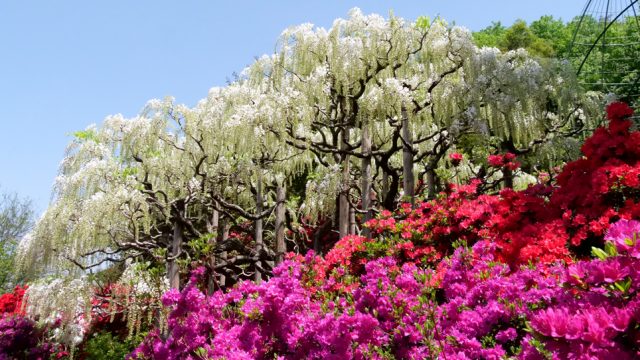 樹齢160年におよぶ広さ1000平方メートルの大藤は、花房が最大で1.8メートルまで伸び、1本の幹から約8万房の花を咲かせるのだとか😲
