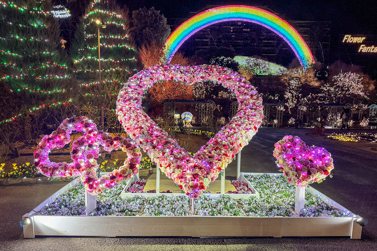 現在、フラワーパーク内では華やかな演出の「バレンタインフェア」も開催中です♡ハートに包まれて記念写真が撮れるスポットも📸