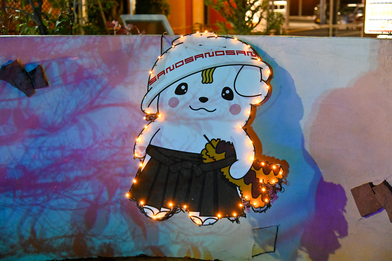 壁面には、佐野市のご当地キャラクター“さのまる”をかたどったパネルが飾られ、縁を囲むライトがやさしく灯っています🐶