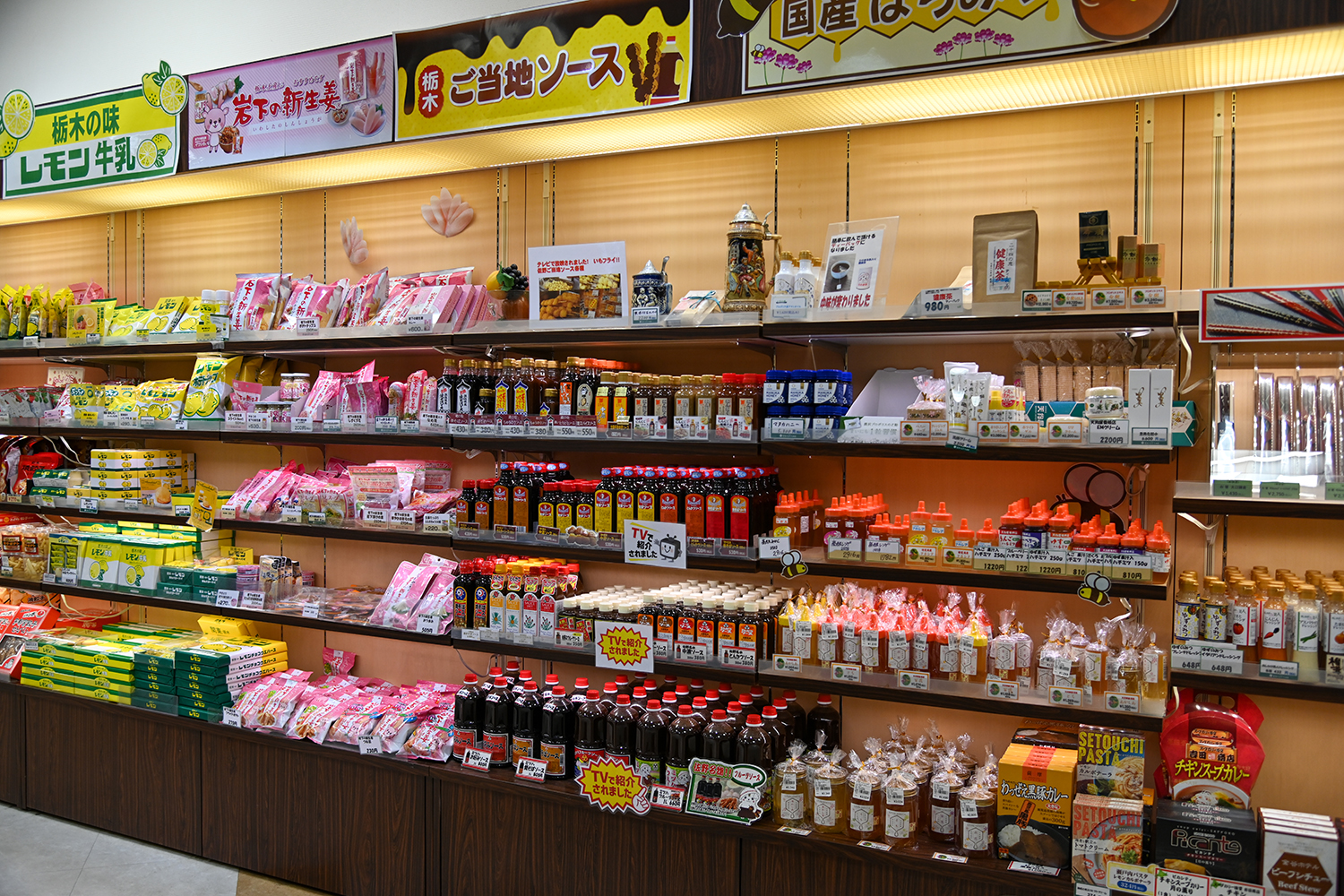 特産品コーナー 「彩り館」 には、レモン牛乳やいちご菓子、ご当地ソースなど栃木らしい商品などもずらりと並んでいました🎁