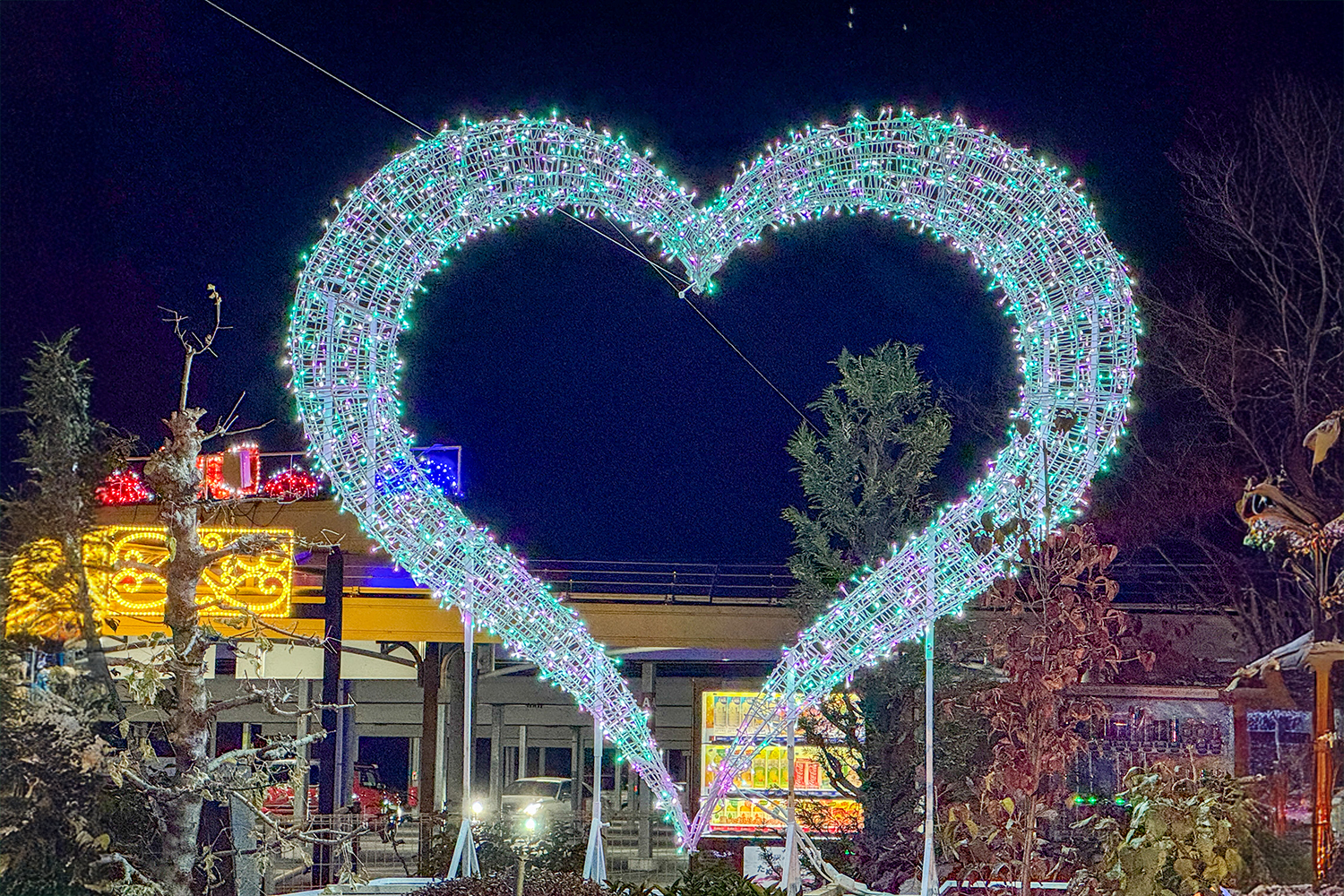 夜空に浮かぶ大きなハートのイルミネーションは、時間とともに色がゆっくり移り変わり冬の景色に華やかさを添えています💗
