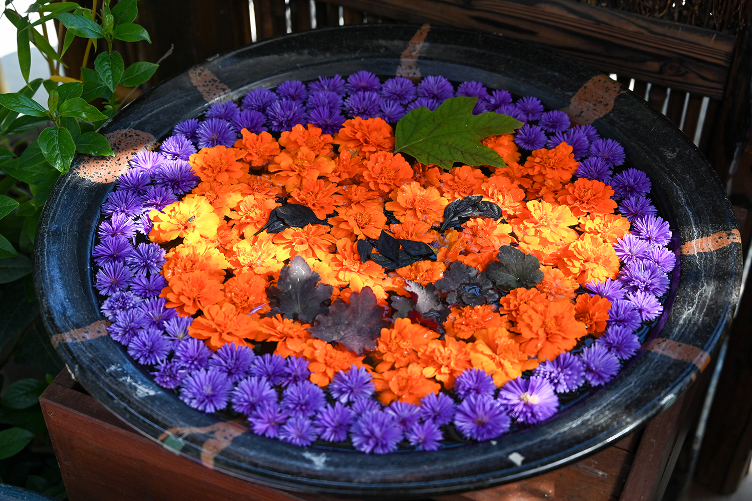 オレンジやパープルの花びらが浮かび、ハロウィンカラーでとっても華やか💜