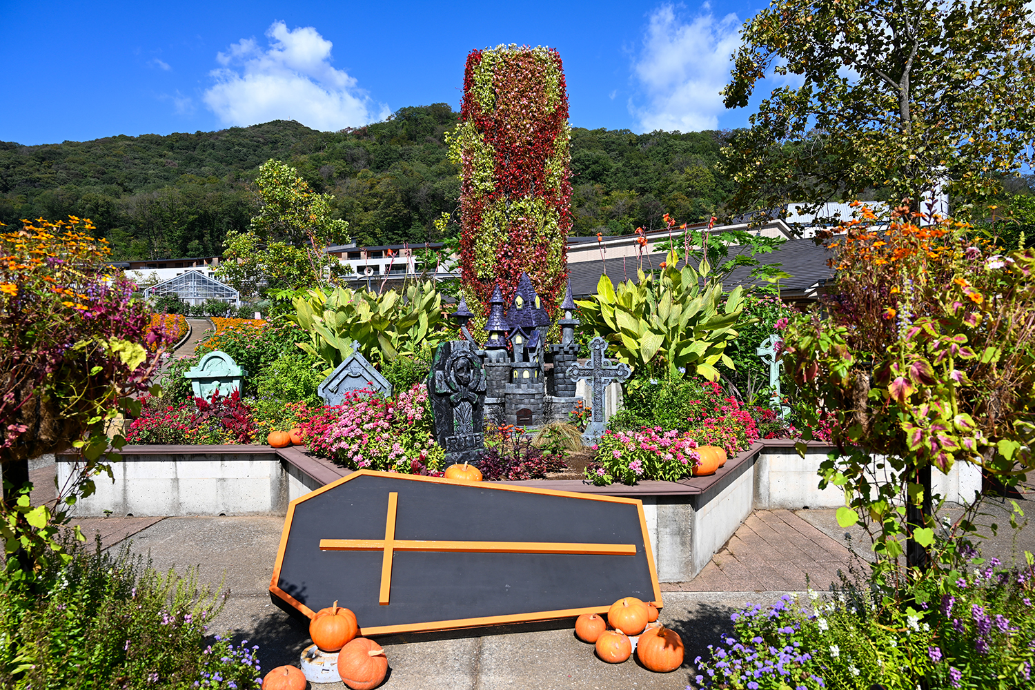 かぼちゃやカラフルな花々が織りなす風景は、まるで植物たちが仮装しているかのよう🎩
