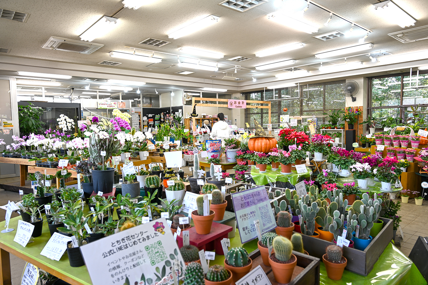 売店「とちはなちゃんのお花屋さん」には、季節の鉢植えや多肉植物、サボテンなどがずらり🌿