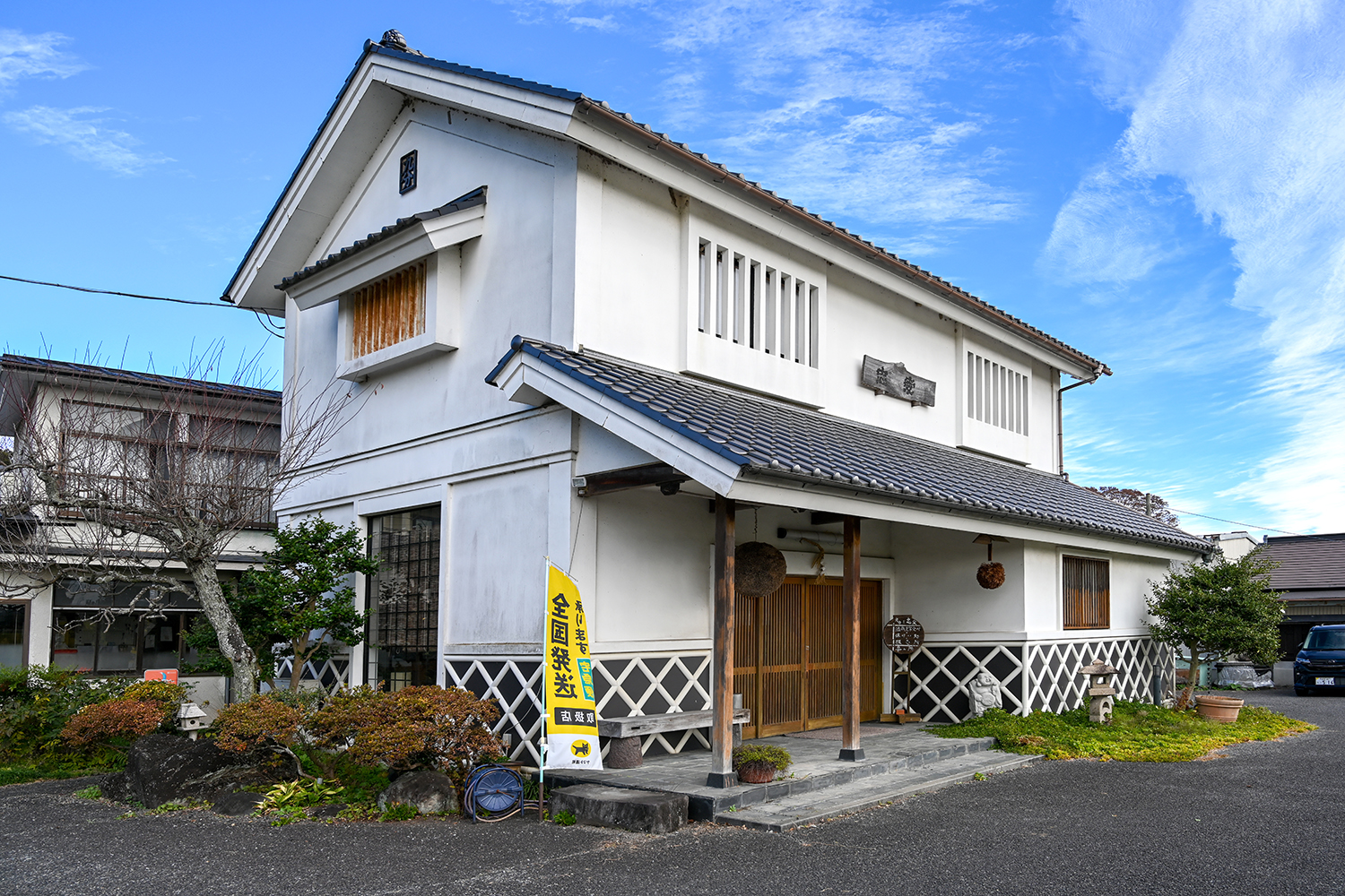 白壁が青空に映える蔵の佇まいは、創業以来続く酒造りの歴史を静かに語り、矢板の風土とともに歩んできた富川酒造らしい落ち着いた存在感を放っています✨