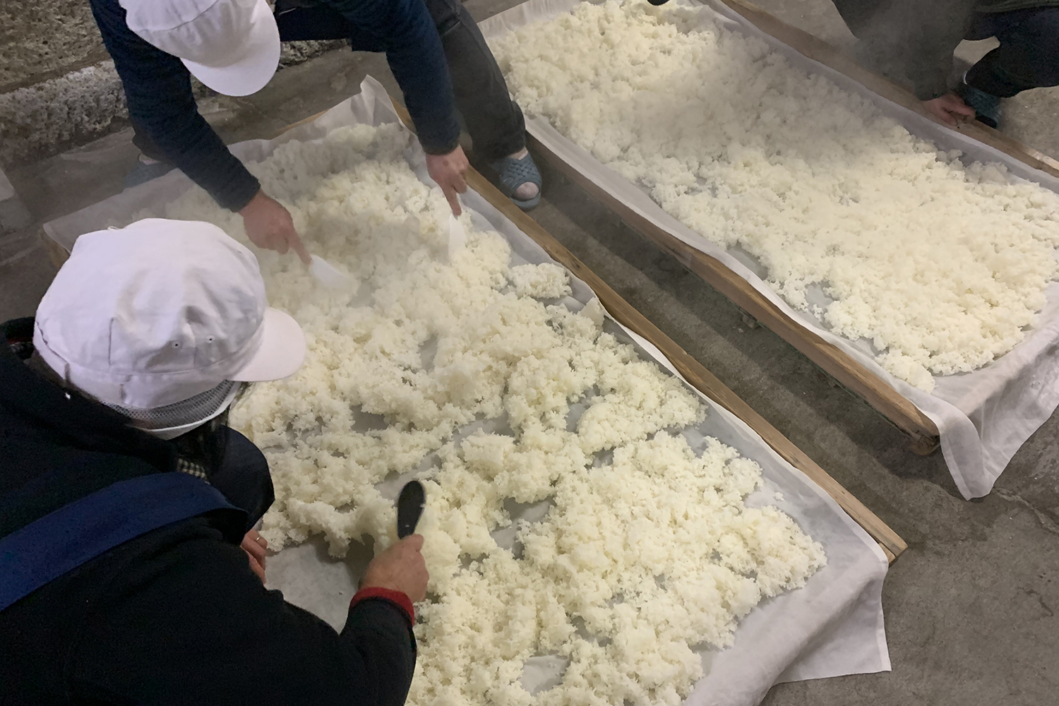 蒸し上がった米を丁寧に広げていくこの作業には、温度や湿り気を見極める職人の経験が凝縮されており、ひと粒ひと粒に向き合う真摯な手仕事から富川酒造の酒が育っていく瞬間が伝わってきます。