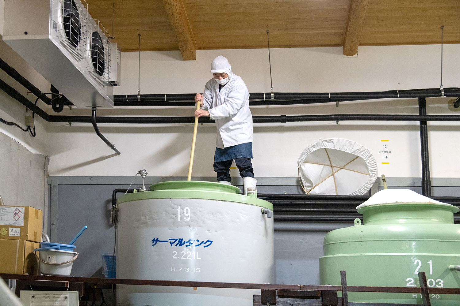 大きなタンクの上で、櫂を入れながらもろみの状態を確かめる蔵人🧑🍳
