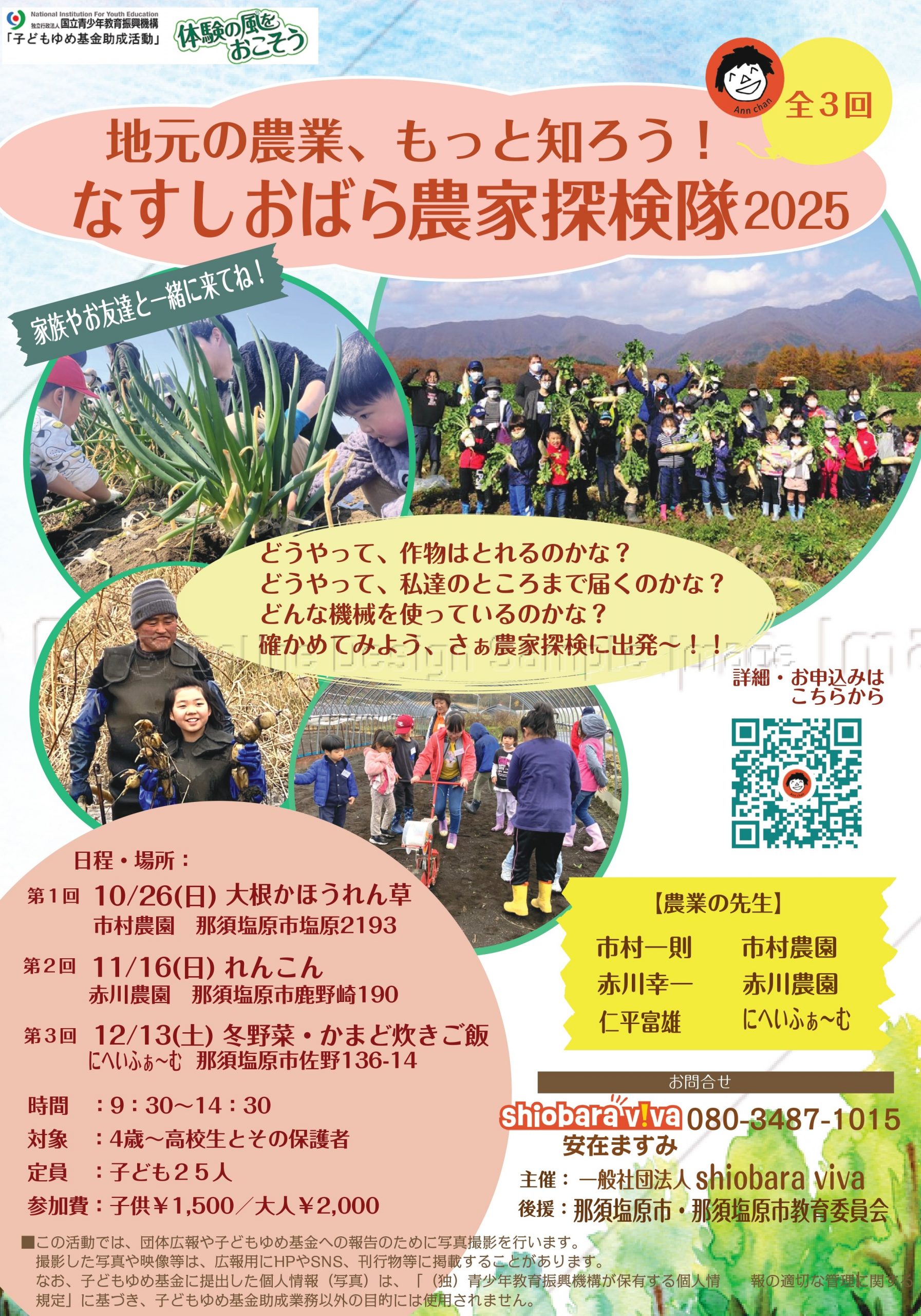 【親子体験】地元の農業もっと知ろう!なすしおばら農家探検隊2025 開催予定 shiobaravivaでは、10/26(日)・11/16(日)・12/13(土)に、「なすしおばら農家探検隊2025」を開催します。 畑は学びの宝庫!土にふれて、心も育つ。収穫の感動と、大地からの贈り物に笑顔があふれる体験が待っています! 詳細はこちら↓ https://x.gd/7eXr3 開催日時 10月26日 9:30 AM - 2:30 PM 開催場所 志村農園 住所 那須塩原市塩原2193 Google Map 参加費用 ¥2000 お問い合わせ 那須農業振興事務所