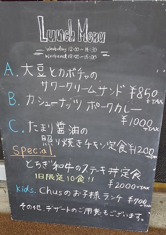 パンは那須町の「クーロンヌ」さんの食パンを使用していて、歯ごたえが良く、中には那須塩原市の平山さんのカボチャと那須町のスノハウスさんのレタス、塩谷町いなほ総合農園さんの大豆がふんだんに使われ、野菜づくしの美味しいサンドでした(^o^)また、サワークリームのほどよい酸味が、食欲を刺激します 😀 『Chus』さんでは季節や時期に応じて、様々な農産物を使用しているそうです。
