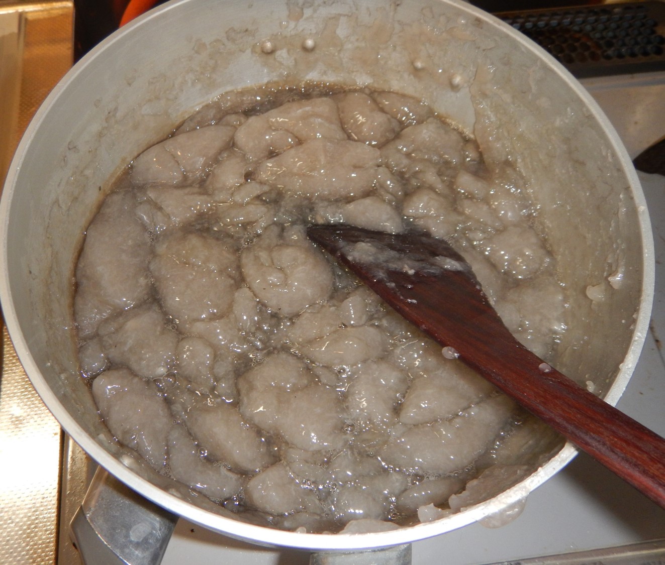 ※蒟蒻芋には「シュウ酸カルシウム」という強い毒性を持つ物質が含まれているため、肌に芋が触れるとかゆくなったり痛くなったりします。こんにゃくができあがるまで素手で芋を触ってはいけません。 中は意外と白かった…。梨の皮をむいているようなやわらかさでした。匂い…は、例えづらいですが…いちぢくみたい? 芽の部分を取り除きます。ここで計量し直します。280gでした。芋1000g当たりこんにゃくの素が25gとのことなので、今回は素を8g使います。   ぬるま湯1リットルをボウルに入れて、その中に芋をすりおろしていきます。この時、右手のゴム手袋をおろし器で破ってしまい、ダメにしてしまいました。予備が必要でした。 おろし終わるとこんな感じです。赤い色になってしまいました。アクの色でしょうか。もうすでにどろどろしています。 おなべに入れて弱火でこねていきます。というかこんな色で大丈夫なのか不安になってきました。赤いこんにゃくができてしまうの? 20分ほどこねると鍋から離れてお餅っぽくなってきました。うっすら透明感もあります。ここで火をとめて、ぬるま湯に溶かしたこんにゃくの素を一気に投入!!